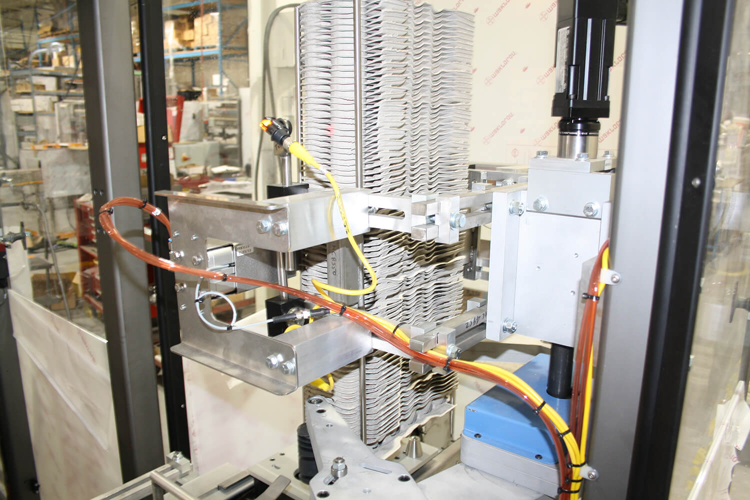 We can seamlessly integrate our feeders or denesters into major machines on the end-of-line packaging line, such as cartoners, case packers, and palletizers. For example, our leaflet feeders can integrate into a cartoner bucket conveyor to feed leaflets into buckets at speeds up to 200 leaflets per minute. Another example is a robotic end cap denestor to denest end caps and automatically places them on canisters, rolls, and other applications.